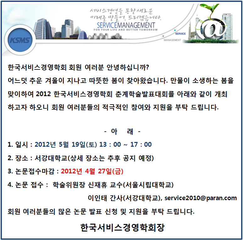 2012 한국서비스경영학회 춘계학술발표대회 안내 및 논문 접수