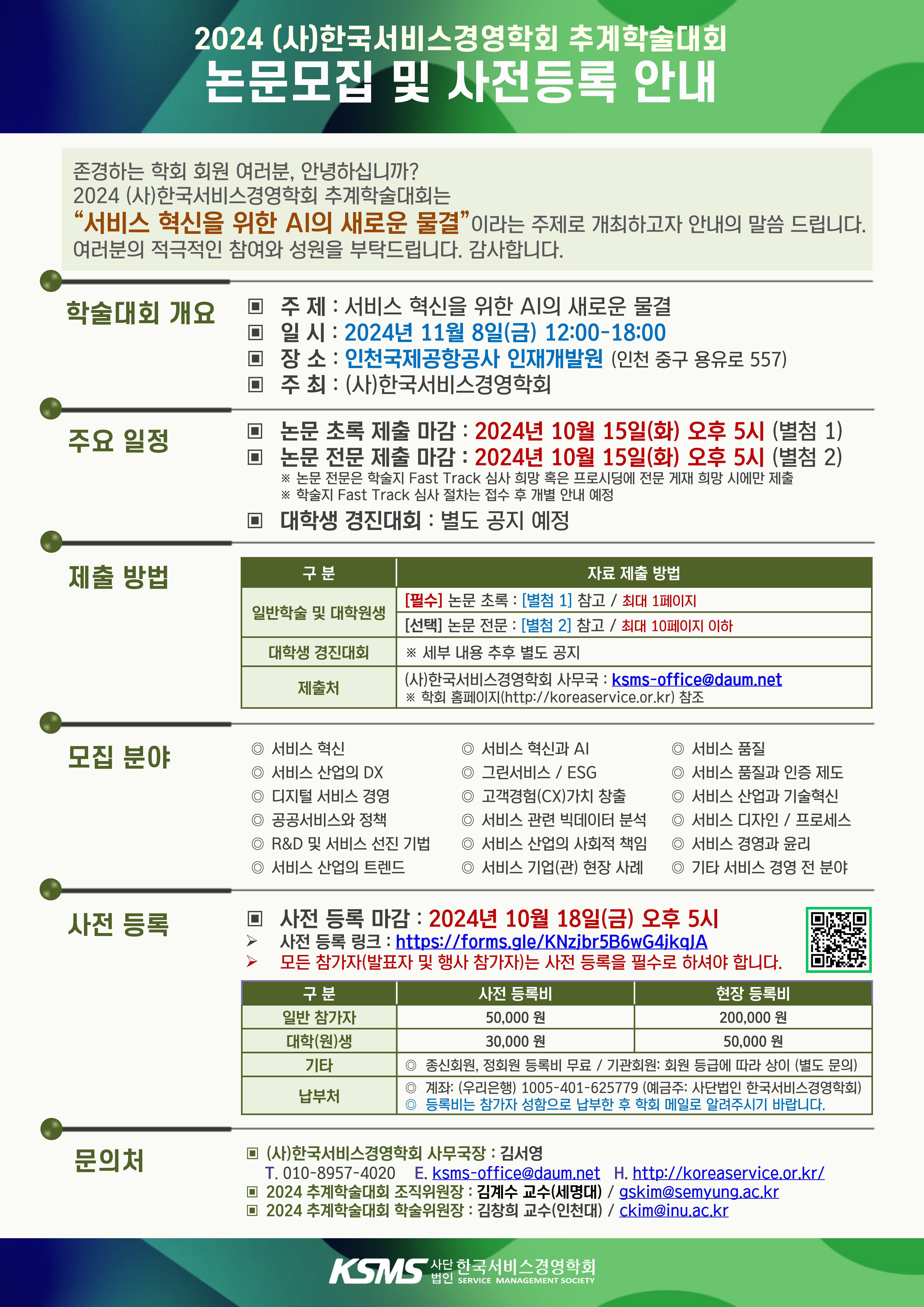 아래와 같이 2024 추계학술대회 논문모집 안내 및 사전등록 링크를 보내 드리니, 기간 내에 신청 부탁드립니다. (자세한 내용은 첨부파일 참고)