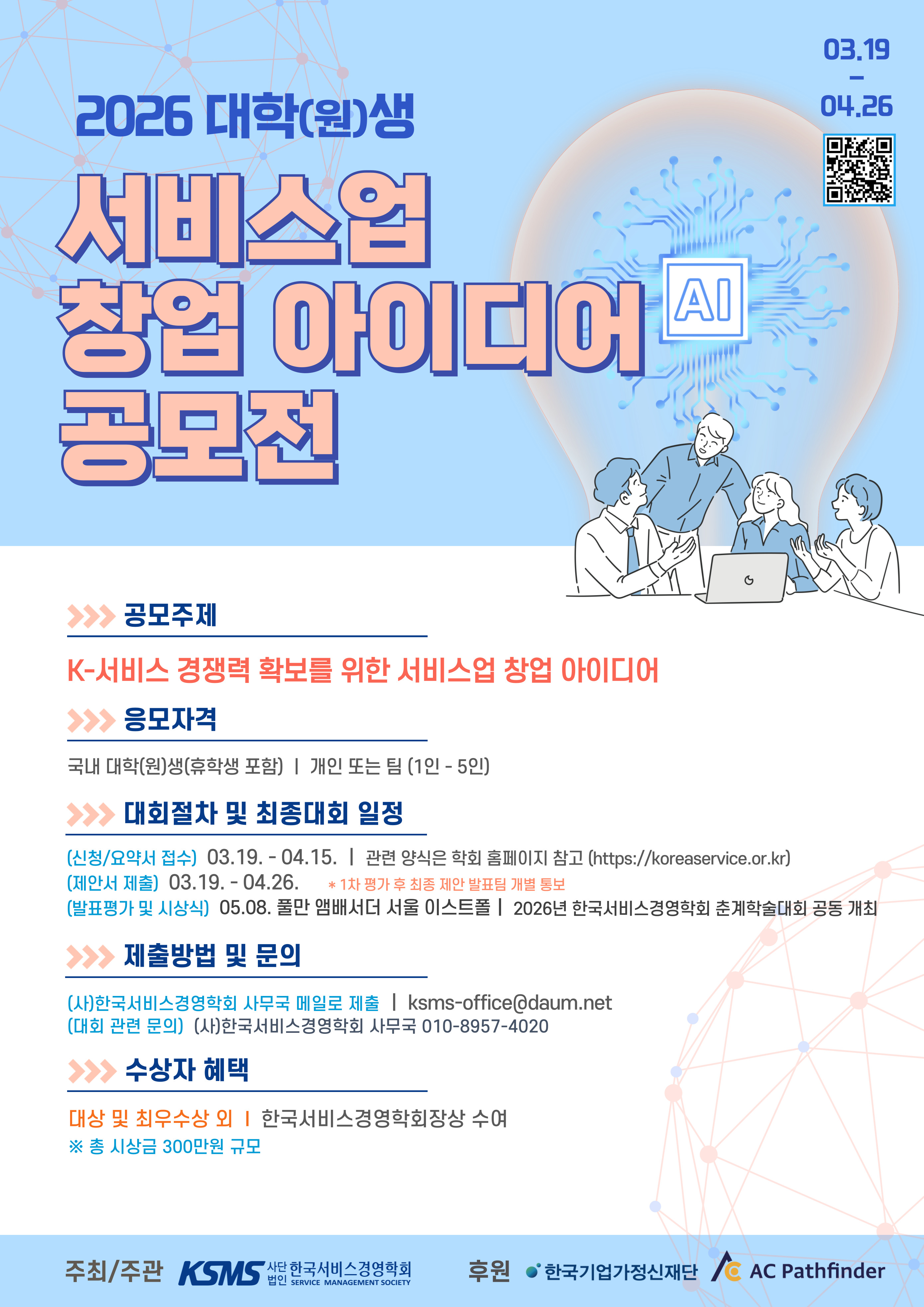 한국기업가정신재단·AC패스파인더의 후원으로 춘계 대학(원)생 서비스업 창업 아이디어 공모전을 개최합니다.